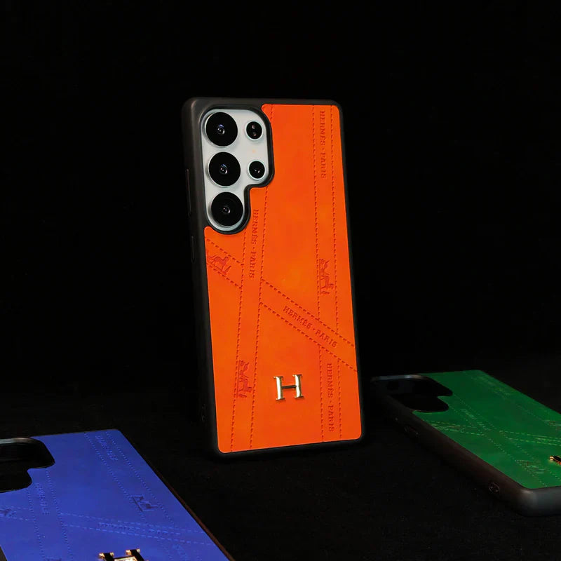 Crafted from premium leather-textured material, it offers a refined touch and a slim profile that doesn't compromise on protection. The centerpiece features a gold-tone "H" motif, adding a touch of prestige to your everyday tech.