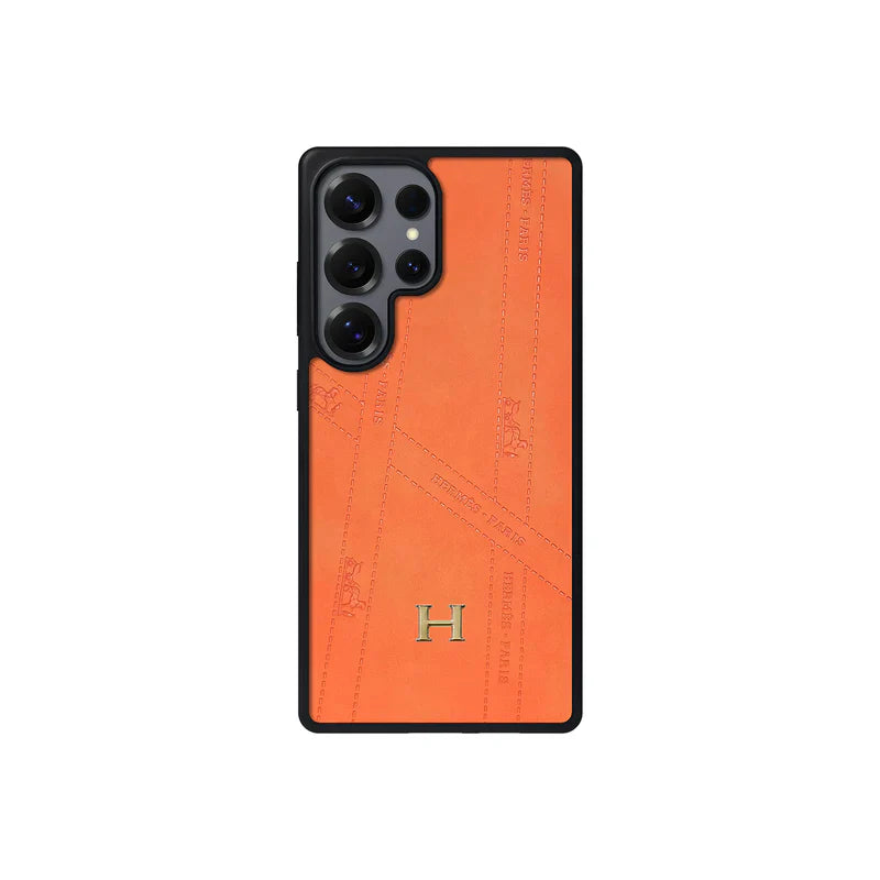 Upgrade your device with the ultimate statement of sophistication. This luxury leather case, designed to fit the Samsung Galaxy S22 through S26 series, captures the essence of high-end fashion with its iconic orange hue and embossed "Bolduc" ribbon detailing.